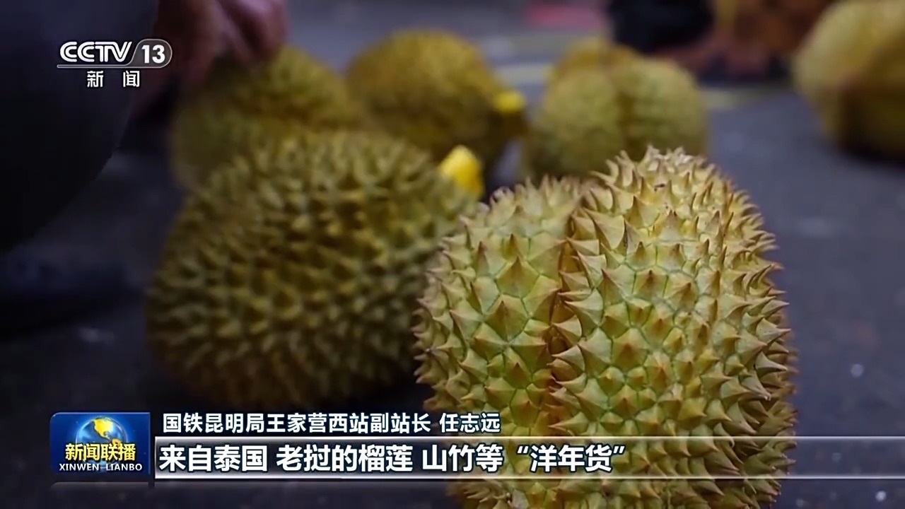 國鐵昆明局王家營西站副站長 任志遠(yuǎn):今年以來,車站進(jìn)出口貨物明顯增加,來自泰國、老撾的榴蓮、山竹等“洋年貨”源源不斷運抵。國內(nèi)的“國貨潮牌”陸續(xù)運往東南亞國家。