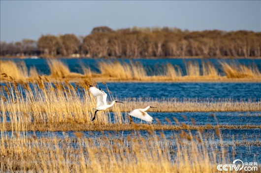 黑龍江齊齊哈爾,天氣回暖,一對(duì)白琵鷺來(lái)到扎龍自然保護(hù)區(qū)克欽湖濕地筑巢安家。