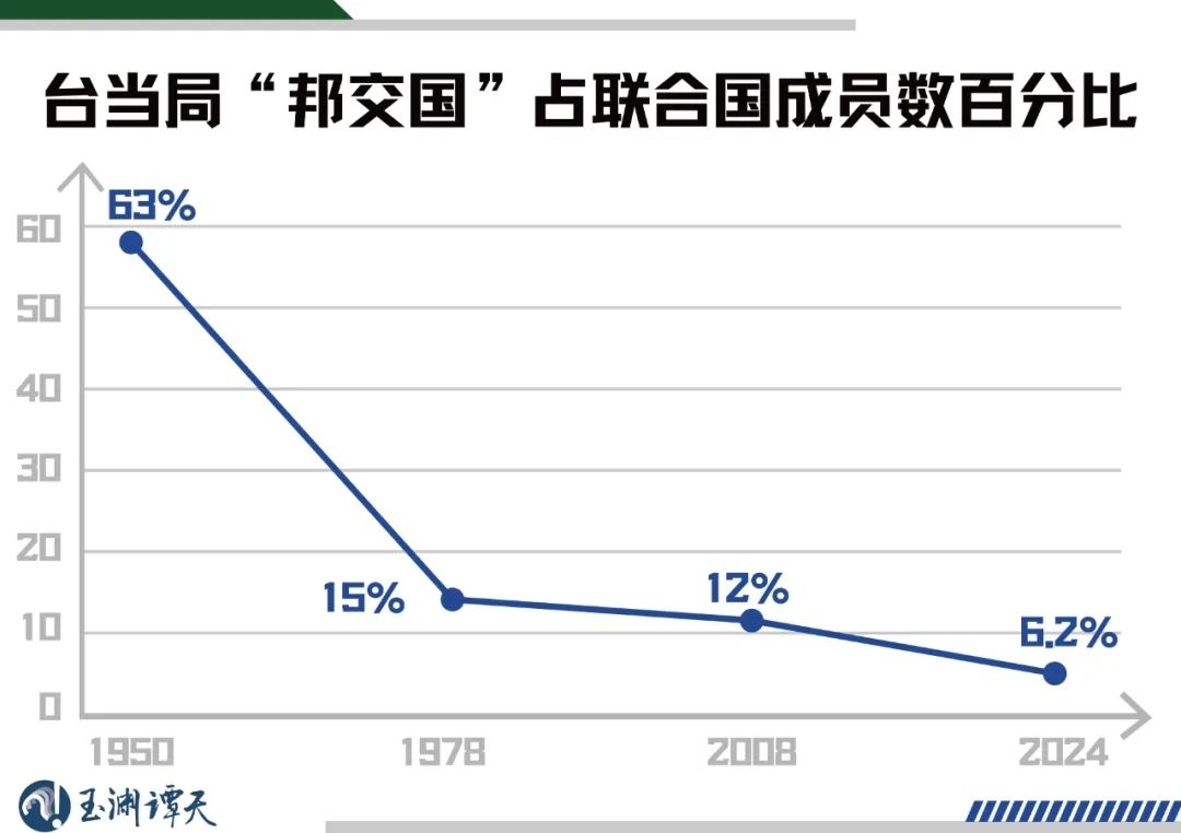 可以看到,1950年,臺(tái)灣當(dāng)局“邦交國(guó)”數(shù)量占聯(lián)合國(guó)成員國(guó)數(shù)量的比例,還高達(dá)63%。