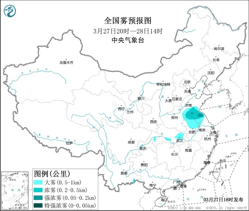 央視網(wǎng)消息:中央氣象臺3月27日18時發(fā)布大霧黃色預(yù)警:預(yù)計(jì),3月27日夜間至28日上午,山東南部、河南東部、安徽中北部、江蘇中北部、湖北東部和南部等地的部分地區(qū)有大霧,其中,山東南部、安徽北部、江蘇北部等地的部分地區(qū)有能見度低于500米的濃霧,局地有能見度低于200米的強(qiáng)濃霧。