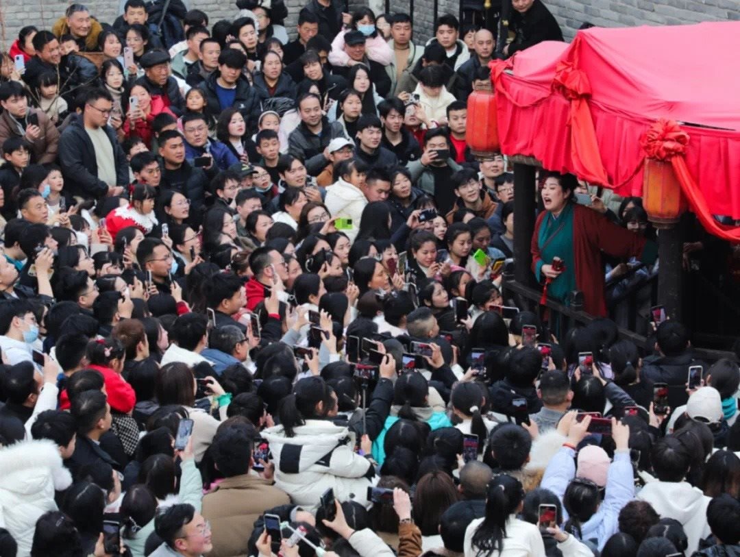 這個(gè)春日,午后的萬歲山武俠城景區(qū)水滸街王婆茶館前,熙熙攘攘的人群包圍了舞臺(tái)三面,每個(gè)能看到臺(tái)上的縫隙都被填滿,水泄不通,一旁茶樓二層的好位置已早早被預(yù)訂,有人不遠(yuǎn)千里只為一睹真容。