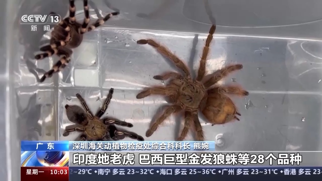 深圳海關(guān)動植物檢疫處綜合科科長 熊婉:查驗關(guān)員在對轉(zhuǎn)運快件開展監(jiān)管時,發(fā)現(xiàn)一票申報品名為“相機三腳架”的快件包裹機檢圖像異常,不符合相機三腳架的圖像特征,隨后進行了開包查驗。經(jīng)過專業(yè)機構(gòu)鑒定,這批活體蜘蛛是墨西哥金背紅尾蛛、印度地老虎、巨人偽鳴蛛、巴西巨型金發(fā)狼蛛等28個品種。