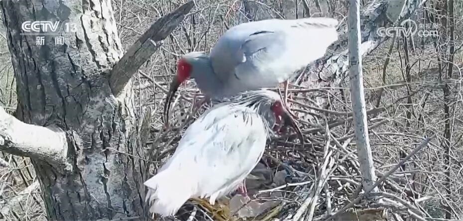 陜西銅川野生動(dòng)物保護(hù)管理站的監(jiān)測(cè)畫(huà)面顯示,4月12日,一對(duì)朱鹮夫婦,一只在巢穴中臥巢,另一只則守在一旁不時(shí)整理巢穴。沒(méi)過(guò)多久,臥巢的這只朱鹮站了起來(lái)。仔細(xì)觀察,它身下的四枚卵中有一枚已經(jīng)孵化成功。