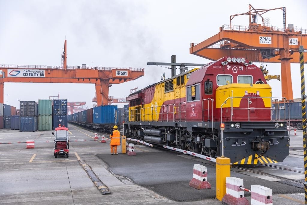 3月7日,一列滿載機械設(shè)備、整車及零部件等貨物的中歐班列在重慶團結(jié)村中心站等候發(fā)車。新華社記者 黃偉 攝