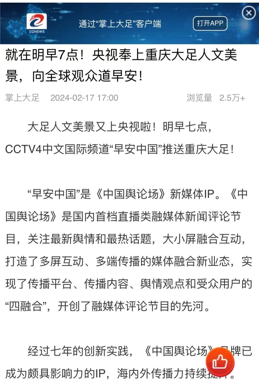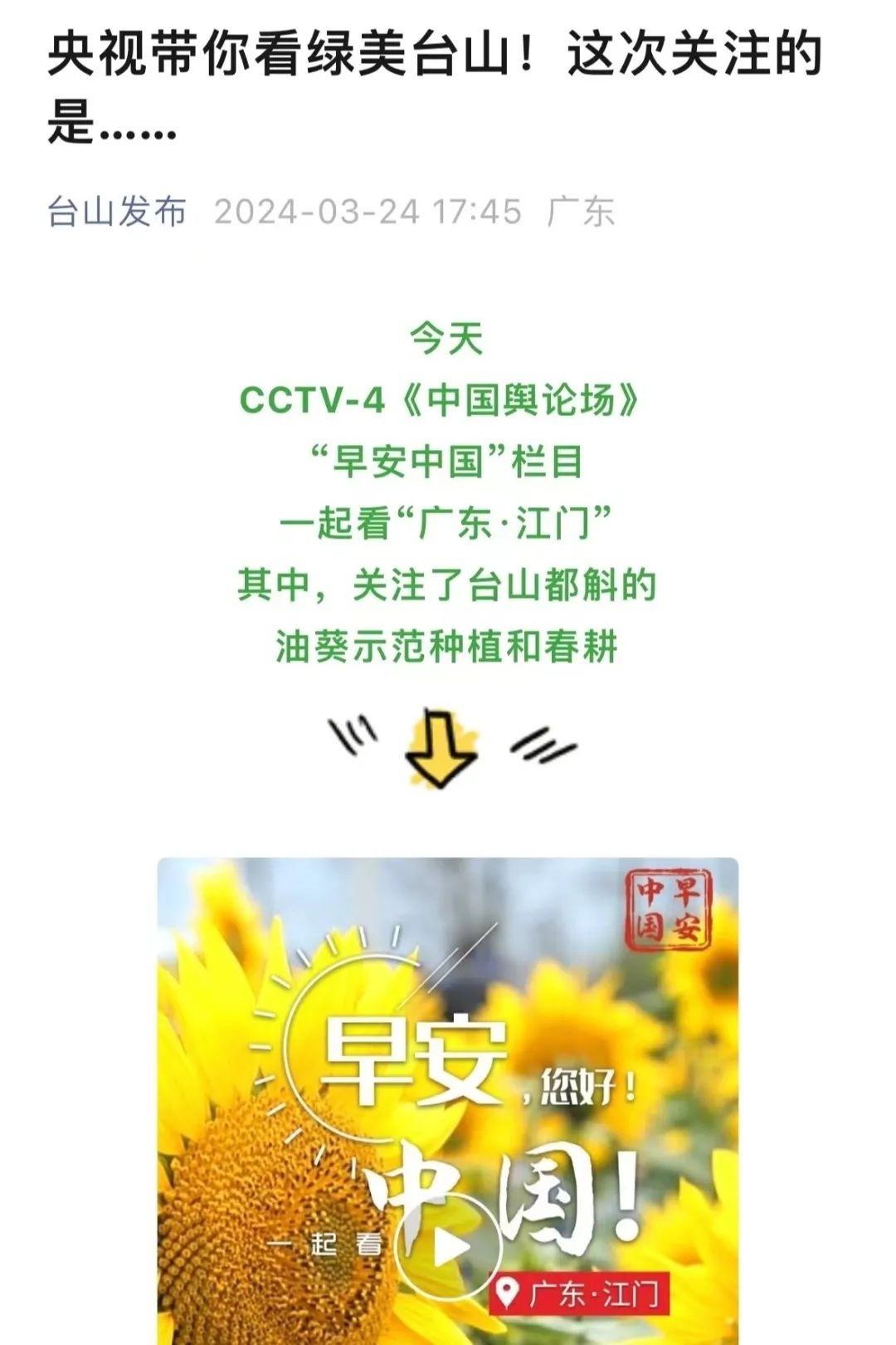 “央視帶你看綠美臺(tái)山,這次關(guān)注的是......”“就在明早7點(diǎn)!央視奉上重慶大足人文美景,向全球觀眾道早安!”“央視聚焦!徐州,有美景,有年味”“金葵向陽(yáng)開(kāi),中春好景和風(fēng)裁!美麗江門(mén)與您相遇央視《早安中國(guó)》”……越來(lái)越多的地方政府伸出橄欖枝,希望《早安中國(guó)》多“來(lái)”當(dāng)?shù)匾挥[好風(fēng)光。