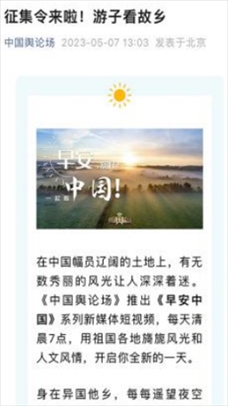 每天早7點(diǎn),新媒體用戶(hù)一起床,打開(kāi)《中國(guó)輿論場(chǎng)》,美妙的音樂(lè)喚醒耳朵,美麗的風(fēng)景賞心悅目,再加上一句經(jīng)典典故,迎接美美的一天!