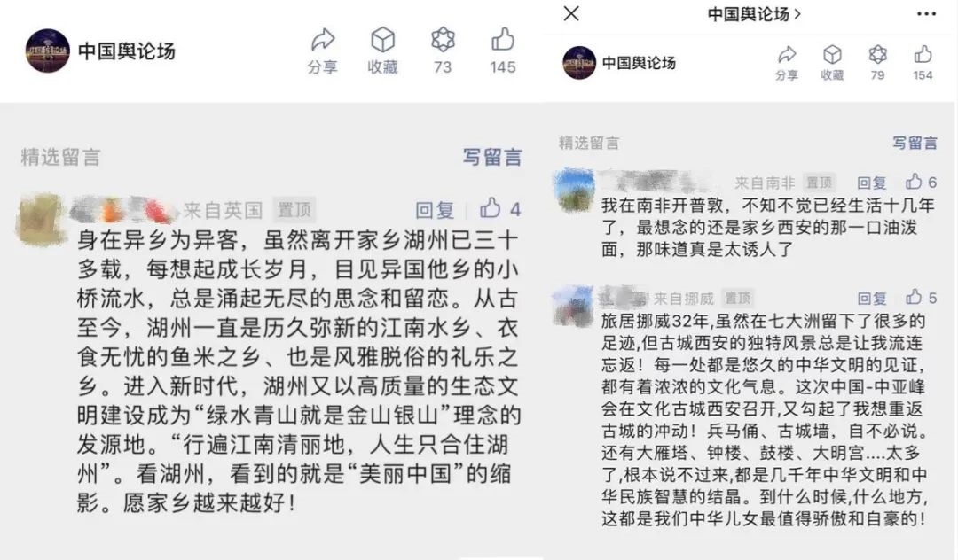 “早安中國(guó)切口新穎,有文化屬性和微記錄的氣質(zhì)?!薄懊看纹驳慕Y(jié)語(yǔ)字幕,都是從哪里選的?每天,都給我學(xué)習(xí)的機(jī)會(huì)?!薄皩?zhuān)業(yè)微記錄是媒體融合最寬廣的路?!薄对绨仓袊?guó)》真真切切地緩解了許多海內(nèi)外網(wǎng)友的故土思鄉(xiāng)情切,也收到了來(lái)自四面八方的認(rèn)可及反饋?!吨袊?guó)輿論場(chǎng)》節(jié)目持續(xù)發(fā)出“游子看故鄉(xiāng)”征集令,請(qǐng)海外華僑華人說(shuō)出對(duì)家鄉(xiāng)的思念和心中最想“打卡”的祖國(guó)美景。