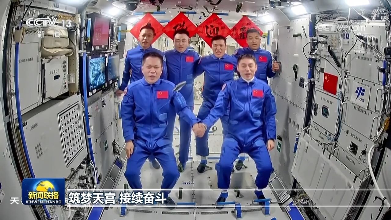 隨后,兩個航天員乘組拍下“全家福”,共同向牽掛他們的全國人民報平安。