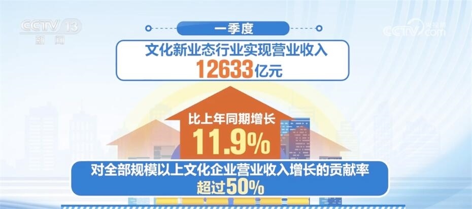 文化新業(yè)態(tài)行業(yè)持續(xù)發(fā)揮帶動效應(yīng),一季度,文化新業(yè)態(tài)行業(yè)實現(xiàn)營業(yè)收入12633億元,比上年同期增長11.9%,對全部規(guī)模以上文化企業(yè)營業(yè)收入增長的貢獻率超過50%。