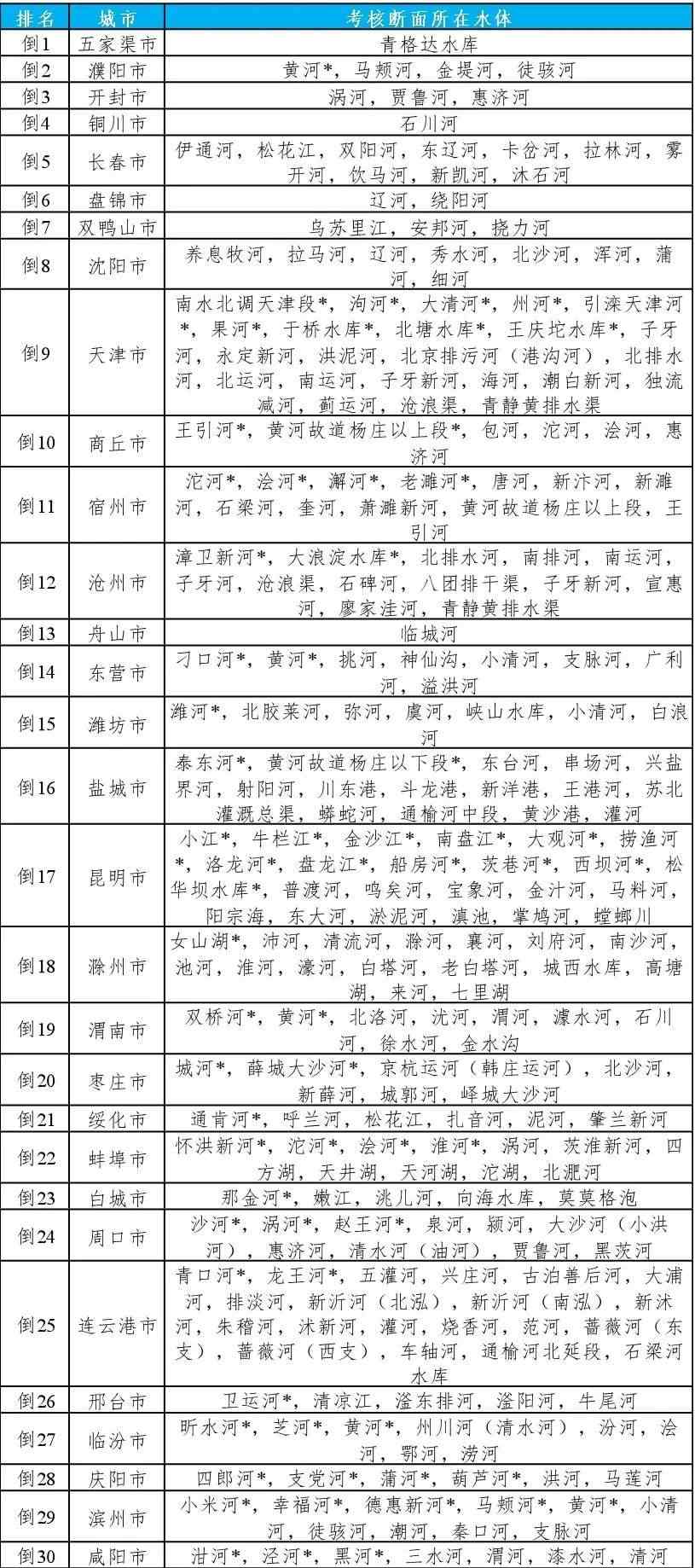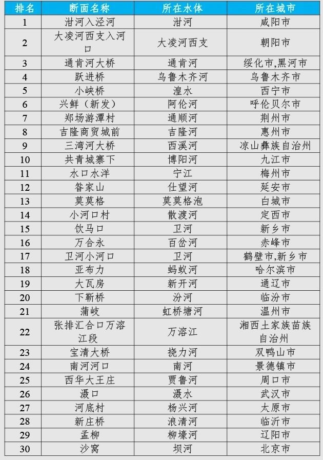 咸陽市泔河入涇河、朝陽市大凌河西支入河口和綏化市/黑河市通肯河大橋等30個(gè)國家地表水考核斷面水環(huán)境質(zhì)量變化情況相對(duì)較好(從第1名至第30名),渭南市裕西、天津市新老米店閘和玉溪市化念水庫等30個(gè)國家地表水考核斷面水環(huán)境質(zhì)量變化情況相對(duì)較差(從倒數(shù)第1名至倒數(shù)第30名)。