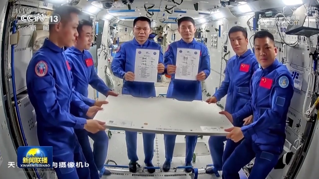 下午三時許,神舟十七號航天員湯洪波、唐勝杰、江新林和神舟十八號航天員葉光富、李聰、李廣蘇在空間站天和核心艙在軌舉行交接儀式,6名航天員分別在確認(rèn)書上簽字。