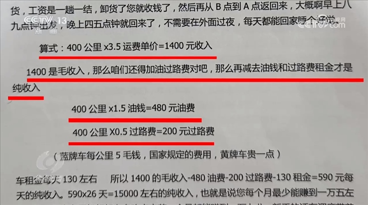 這些公司在和司機(jī)簽約時(shí),根據(jù)司機(jī)個(gè)人情況的不同,對(duì)他們收取幾千元到幾萬(wàn)元不等的費(fèi)用。還沒掙錢就先交錢,而且交的還不少,司機(jī)們?yōu)槭裁磿?huì)心甘情愿地交這些錢呢?因?yàn)槊嬖嚂r(shí),公司給司機(jī)們?cè)敿?xì)算過(guò)他們的收入。