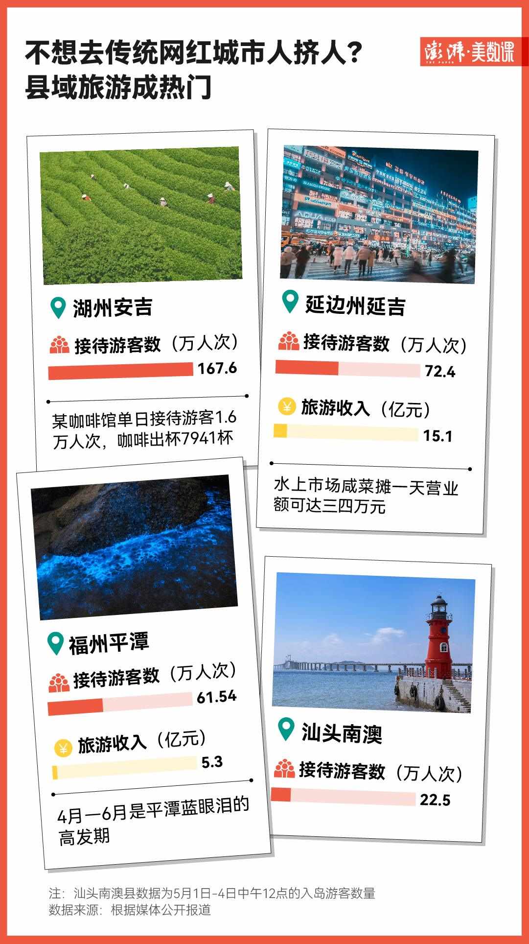 不僅如此,旅游下沉化的趨勢已經(jīng)來到了縣級市。湖州安吉在這個“五一”假期就收獲了167.6萬人次的游客數(shù)量。據(jù)“安吉旅游”公眾號,當(dāng)?shù)啬晨Х瑞^單日接待游客1.6萬人次,咖啡出杯7941杯。