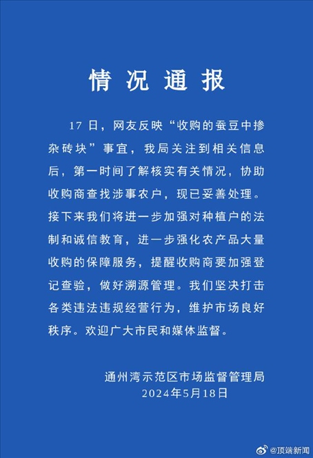 ·網(wǎng)友反映“收購(gòu)的蠶豆中摻雜磚塊”,南通發(fā)布情況通報(bào)。
