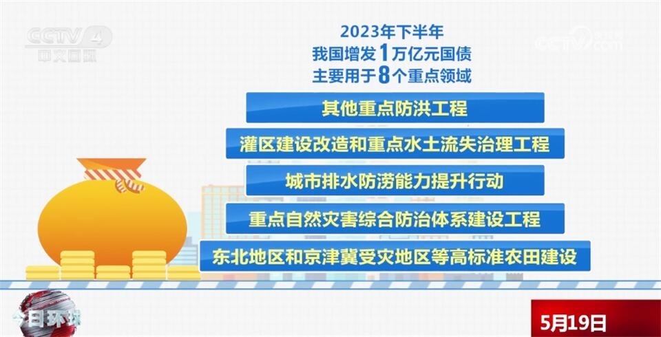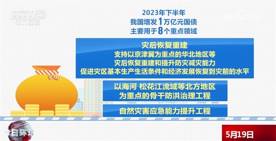 去年下半年,我國(guó)增發(fā)了1萬億元國(guó)債,主要用于8個(gè)重點(diǎn)領(lǐng)域,包括災(zāi)后恢復(fù)重建,支持以京津冀為重點(diǎn)的華北地區(qū)等災(zāi)后恢復(fù)重建和提升防災(zāi)減災(zāi)能力,促進(jìn)災(zāi)區(qū)基本生產(chǎn)生活條件和經(jīng)濟(jì)發(fā)展恢復(fù)到災(zāi)前的水平,以海河、松花江流域等北方地區(qū)為重點(diǎn)的骨干防洪治理工程,自然災(zāi)害應(yīng)急能力提升工程,其他重點(diǎn)防洪工程,灌區(qū)建設(shè)改造和重點(diǎn)水土流失治理工程,城市排水防澇能力提升行動(dòng),重點(diǎn)自然災(zāi)害綜合防治體系建設(shè)工程,東北地區(qū)和京津冀受災(zāi)地區(qū)等高標(biāo)準(zhǔn)農(nóng)田建設(shè)。