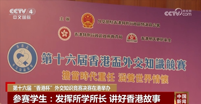 央視網(wǎng)消息:第十六屆“香港杯”外交知識競賽決賽暨頒獎典禮5月18日在港舉辦。今年競賽以“擔當時代重任 涵養(yǎng)世界情懷”為主題,吸引了全港263所中小學近7萬人報名參賽。參賽學生表示,通過參加競賽進一步增強了民族自豪感,立志發(fā)揮所學所長,講好香港故事和中國故事。