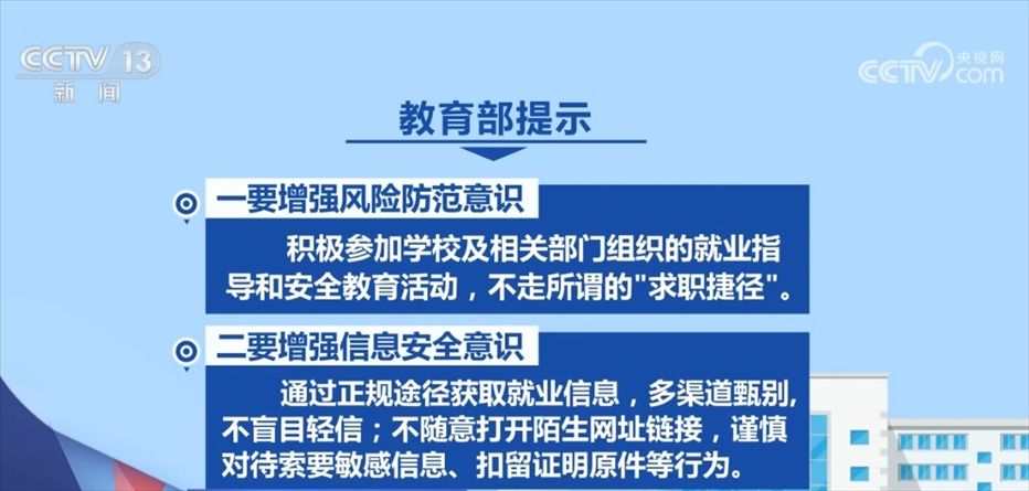 央視網(wǎng)消息:目前正值高校畢業(yè)生求職關(guān)鍵期,教育部發(fā)布預(yù)警提示,一些不法分子打著招聘的幌子挖“坑”設(shè)陷,詐騙錢財(cái)、盜用信息、誘導(dǎo)犯罪等現(xiàn)象時(shí)有發(fā)生,嚴(yán)重?fù)p害畢業(yè)生就業(yè)權(quán)益。高校畢業(yè)生在求職過程中一定要增強(qiáng)意識(shí),嚴(yán)防陷阱。?