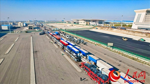 霍爾果斯公路口岸,等待通關的汽車。人民網 李欣洋攝