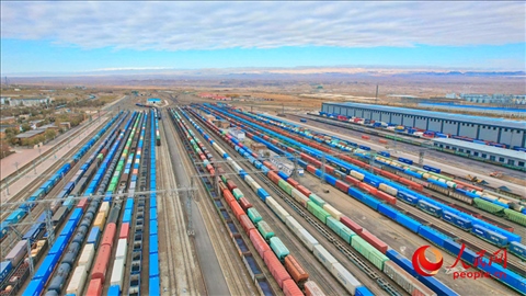 阿拉山口站編組場內停靠著待發(fā)的中歐班列及其他出入境貨物列車。人民網 李欣洋攝