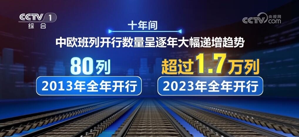 數(shù)據(jù)顯示,十年間,中歐班列開行數(shù)量呈逐年大幅遞增趨勢。2013年全年開行80列,2023年全年開行數(shù)量已超過1.7萬列。截至今年4月底,已連續(xù)48個月單月開行數(shù)量保持在千列以上。