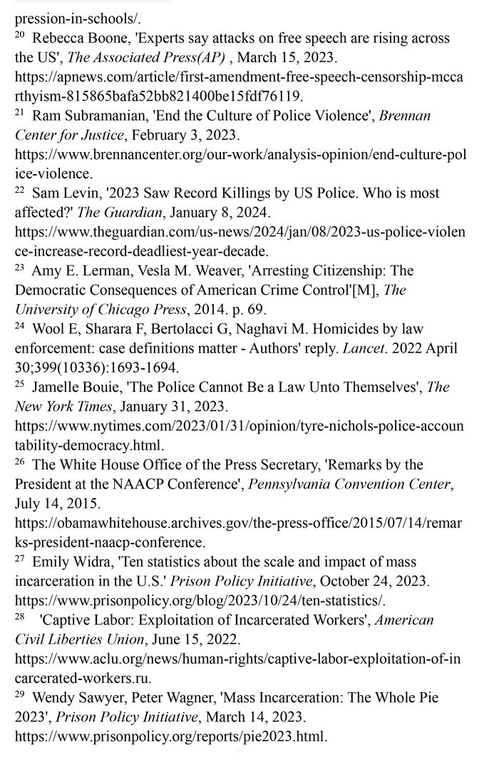非洲裔在執(zhí)法領(lǐng)域面臨嚴重種族歧視。2023年1月3日,洛杉磯31歲的非洲裔男子基南·安德森涉嫌交通肇事,警方在制服他的過程中使用電擊槍擊中其6次,致其心臟病發(fā),送醫(yī)不治身亡。(注39)2023年1月7日,田納西州孟菲斯市的警察以“魯莽駕駛”為由將29歲的非洲裔男子泰爾·尼科爾斯攔下,并對其進行長達數(shù)分鐘的殘忍毆打。三天后尼科爾斯因傷勢過重去世,而事后的調(diào)查無法證實警察關(guān)于其“魯莽駕駛”的說法。(注40)這兩起非洲裔遭受警察暴力執(zhí)法身亡案例引發(fā)多名聯(lián)合國專家的高度關(guān)注。專家們強調(diào),在兩起事件中,警察使用的武力違反保護生命權(quán),禁止酷刑和其他殘忍、不人道或有辱人格待遇或處罰的國際準則,也不符合聯(lián)合國《執(zhí)法人員行為守則》和《執(zhí)法人員使用武力和火器的基本原則》。(注41)聯(lián)合國人權(quán)理事會在執(zhí)法工作中推進種族正義和平等的國際獨立專家機制在對美國實地訪問后發(fā)布報告指出,針對非洲裔的系統(tǒng)性種族主義已經(jīng)滲透到美國警察隊伍和刑事司法系統(tǒng)。非洲裔被警察殺害的可能性是白人的3倍,被監(jiān)禁的可能性是白人的4.5倍。在每年1000多起警察殺人案件中,只有1%的涉事警察被指控。報告警告說,美國如果不按照國際標準改革警察使用武力的規(guī)則,許多殺戮將繼續(xù)發(fā)生。(注42)