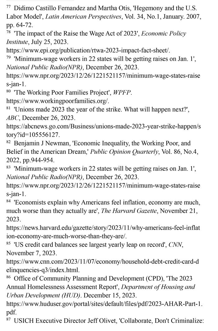 “工作者貧困”問題突出。美國勞動力市場狀況發(fā)生了結(jié)構(gòu)性變化,低薪崗位和缺乏監(jiān)管普遍存在。(注77)有大批“工作窮人”終日勞作,其工資水平卻難以維持基本生計,還缺乏應有的社會保障。美國聯(lián)邦最低時薪標準自2009年以來一直沒有上調(diào)。(注78)美國勞工部的數(shù)據(jù)顯示,2023年仍有20個州維持聯(lián)邦最低時薪標準。(注79)美國有1150萬個低收入工薪家庭,包括1480萬兒童在內(nèi)的2990多萬美國人生活在這些低收入工薪家庭。(注80)勞資收入增長懸殊導致多行業(yè)大面積罷工。2023年,美國發(fā)生了21世紀以來波及范圍最廣的罷工潮,包括影視、制造、醫(yī)療、媒體在內(nèi)的多個行業(yè)都出現(xiàn)大規(guī)模罷工。(注81)加利福尼亞州大學公共政策與政治學院副教授本杰明·紐曼評論稱,陷入結(jié)構(gòu)性貧困之中的“工作窮人”既缺乏機會平等,也難以向上流動,他們極大地降低了對“美國夢”的信念。(注82)
