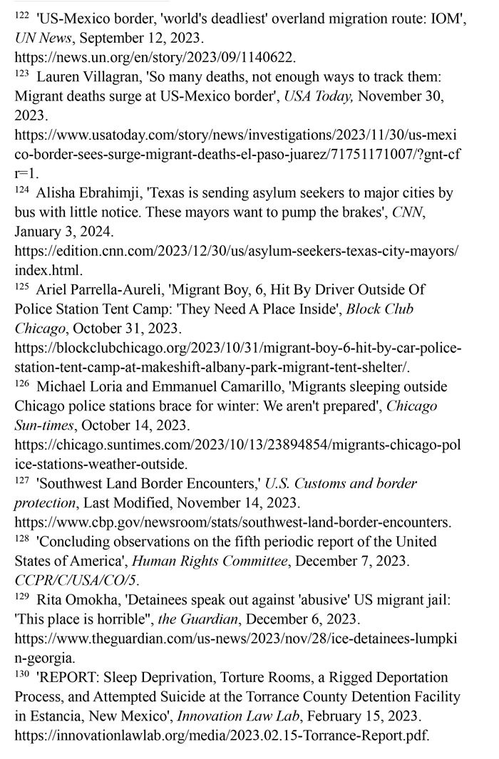 入境移民遭受酷刑及其他不人道待遇。2023財年,在美國南部邊境遭逮捕或驅(qū)逐的移民總數(shù)達240多萬人,再創(chuàng)歷史新高。(注127)聯(lián)合國人權(quán)事務委員會對移民在美國受到長時間的拘留表示擔憂,批評美國的拘留所條件惡劣,人滿為患,被拘押者無法獲得食物、水和醫(yī)療服務,導致包括兒童在內(nèi)的許多人死亡;公共和私營移民拘留設(shè)施存在性暴力、長期單獨監(jiān)禁、虐待等侵犯人權(quán)問題。(注128)英國《衛(wèi)報》網(wǎng)站2023年12月6日報道,由美國私人監(jiān)獄公司CoreCivic運營的、位于佐治亞州蘭普金的斯圖爾特拘留中心存在長期單獨監(jiān)禁、性虐待、醫(yī)療疏忽以及強迫勞動等令人擔憂的問題。(注129)創(chuàng)新法律實驗室于2023年2月15日發(fā)布報告揭露,由CoreCivic運營的、位于新墨西哥州埃斯坦西亞的托蘭斯縣拘留所存在對被關(guān)押者實施酷刑現(xiàn)象。在夜間,每隔15分鐘就會有一名警衛(wèi)開著收音機的最大音量走過這些房間,大聲地敲著門,并用手電筒強光照進房間,吵醒任何可能睡著的人。在寒冷的天氣里,每個房間的通風管道整夜都在吹冷空氣。一些人試圖用衛(wèi)生紙或毯子蓋住通風口,但警衛(wèi)們拿走了用來阻擋冷空氣的任何東西。這些牢房里,廁所污水和糞便溢出,人們被迫睡在臭氣熏天的地板上。(注130)