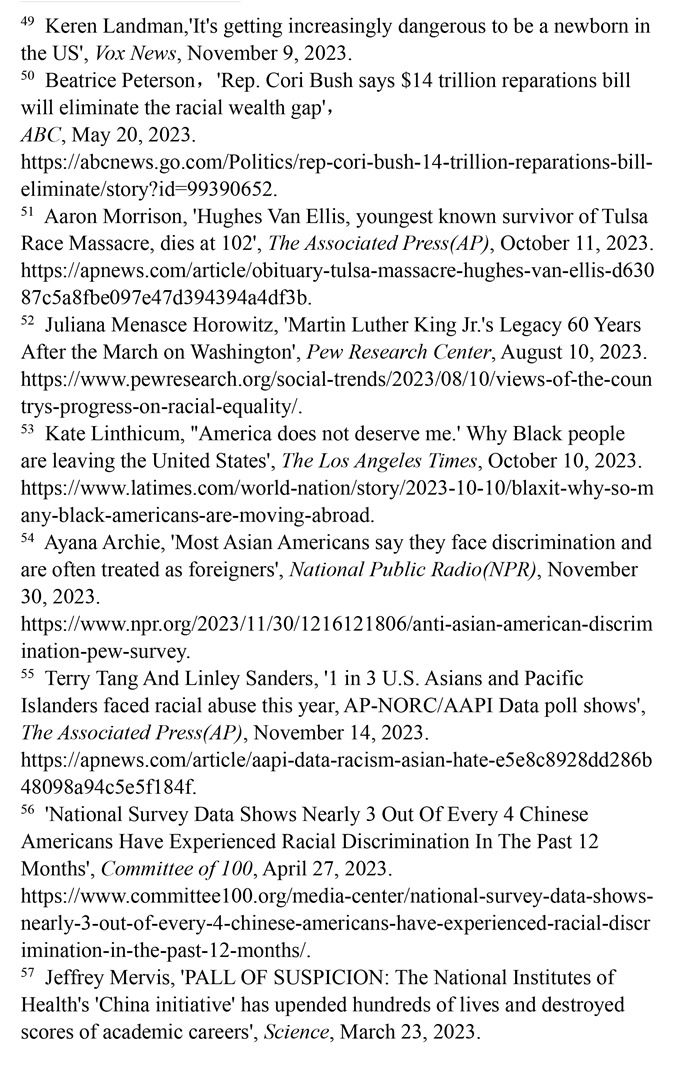 對非洲裔種族迫害的賠償遙遙無期。美國南北戰(zhàn)爭結(jié)束不久后,美國政府承諾向曾被奴役的每一個非洲裔家庭進行賠償,但一百多年來這一承諾從未兌現(xiàn)。1989年,美國眾議院非洲裔議員約翰·科尼爾斯提出“研究和制定非洲裔美國人賠償提案委員會法案”(H.R.40法案),但這一法案數(shù)十年來從未進入過國會表決程序。(注50)1921年,美國俄克拉何馬州塔爾薩地區(qū)發(fā)生針對非洲裔的種族屠殺事件,導致數(shù)百人遇害。為塔爾薩大屠殺最后3位已知幸存者爭取賠償?shù)脑V訟仍未定案,而其中年齡最低的幸存者休斯·范·埃利斯已于2023年10月去世。(注51)皮尤研究中心2023年8月10日發(fā)表的報告顯示,83%的非洲裔美國人表示,美國政府所做的確保平等的努力還遠遠不夠。(注52)許多不滿美國政治和種族歧視的非洲裔選擇離開。離開美國的非洲裔在葡萄牙、加納、哥倫比亞和墨西哥等地建立了新的社區(qū),這已然成為一種名為“Blaxit”的潮流(“Black”和“exit”的結(jié)合),并在社交媒體上廣泛流傳。他們高呼:“美國配不上我!”(注53)