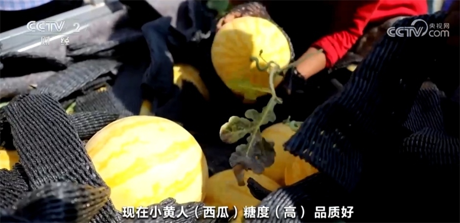西瓜收購商稱:“我今天來這兒收小黃人西瓜,發(fā)往鄭州、北京、上海,各個大城市都發(fā)。現(xiàn)在,小黃人西瓜糖度高、品質(zhì)好。