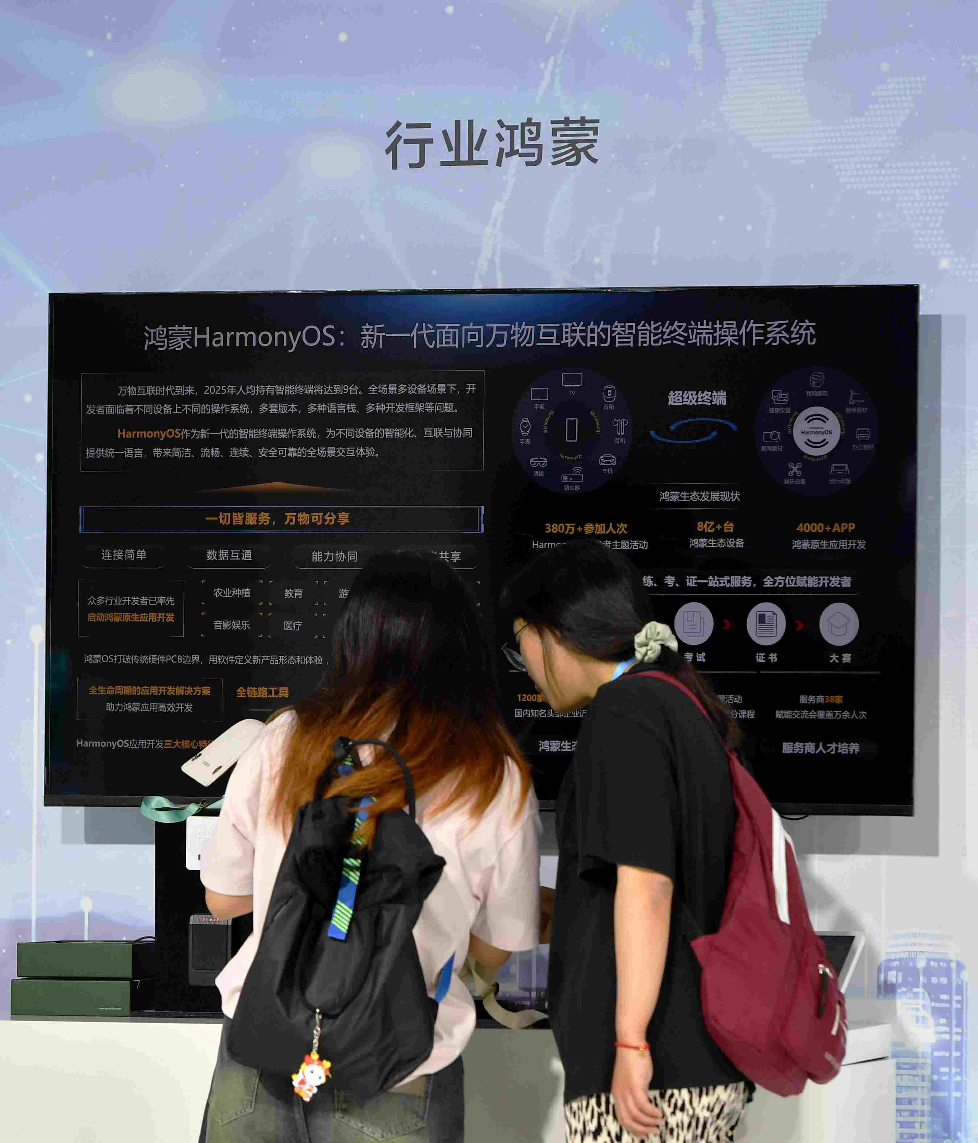 在現(xiàn)場體驗(yàn)區(qū),兩名觀眾在體驗(yàn)鴻蒙智能終端系統(tǒng)。新華社記者魏培全 攝