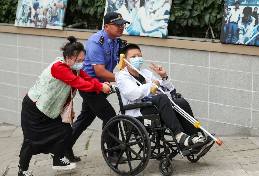 ↑6月7日,在哈爾濱市第三中學(xué)考點(diǎn),一名腳部受傷的考生在工作人員攙扶下走出考場。