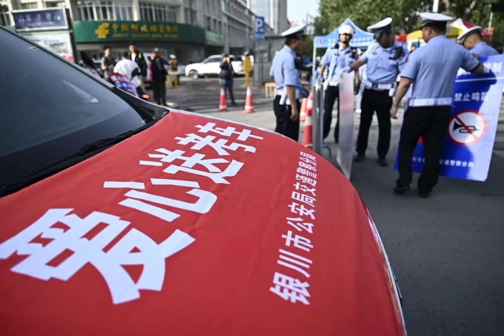 ↑6月7日,寧夏銀川市公安局交通警察分局興慶區(qū)交警一大隊(duì)民警在設(shè)置交通提示標(biāo)牌。