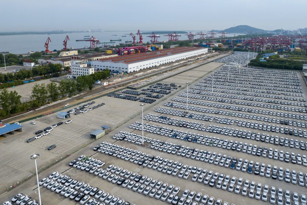 2024年5月26日,在安徽蕪湖港朱家橋港區(qū)國(guó)際集裝箱碼頭,整齊排列的汽車等待出口(無(wú)人機(jī)照片)。作為安徽省首個(gè)國(guó)家一類開(kāi)放口岸,蕪湖港現(xiàn)已發(fā)展成為長(zhǎng)三角城市群綜合交通運(yùn)輸體系的重要樞紐。