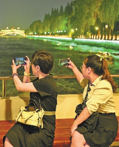文旅融合乘船游覽的游客在拍攝大運(yùn)河揚(yáng)州段沿岸風(fēng)景。本報(bào)記者 雷 聲攝