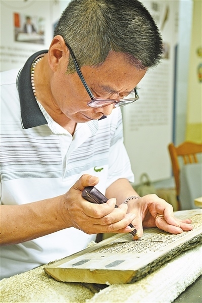 文化傳承揚(yáng)州雕版印刷技藝傳承人進(jìn)行雕版。本報(bào)記者 雷 聲攝