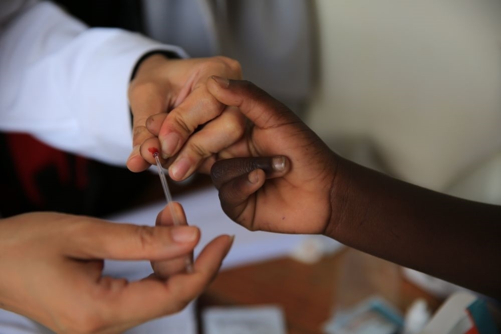 2018年12月8日,在馬拉維南部布蘭太爾市卡迪迪村衛(wèi)生院,第六批中國援馬拉維醫(yī)療隊(duì)醫(yī)生在義診活動中為當(dāng)?shù)鼐用駲z測瘧疾。