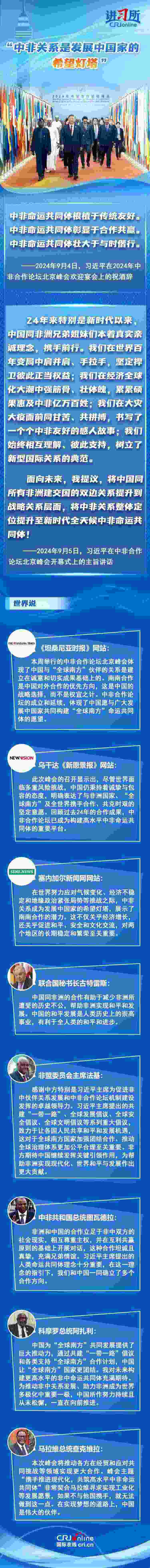 從宣布建立“新型伙伴關(guān)系”,到整體定位提升至“新時(shí)代全天候中非命運(yùn)共同體”,成立24年的中非合作論壇不斷推動(dòng)中非關(guān)系實(shí)現(xiàn)跨越式發(fā)展,特別是新時(shí)代以來(lái),中國(guó)本著真實(shí)親誠(chéng)理念,同非洲兄弟姐妹們攜手前行,受到非方廣泛稱(chēng)贊。非方各界認(rèn)為,為推動(dòng)非中關(guān)系發(fā)展、助力非洲成為世界多極化中重要一極,中國(guó)所作努力持續(xù)且從未松懈,中非關(guān)系是發(fā)展中國(guó)家的希望燈塔。