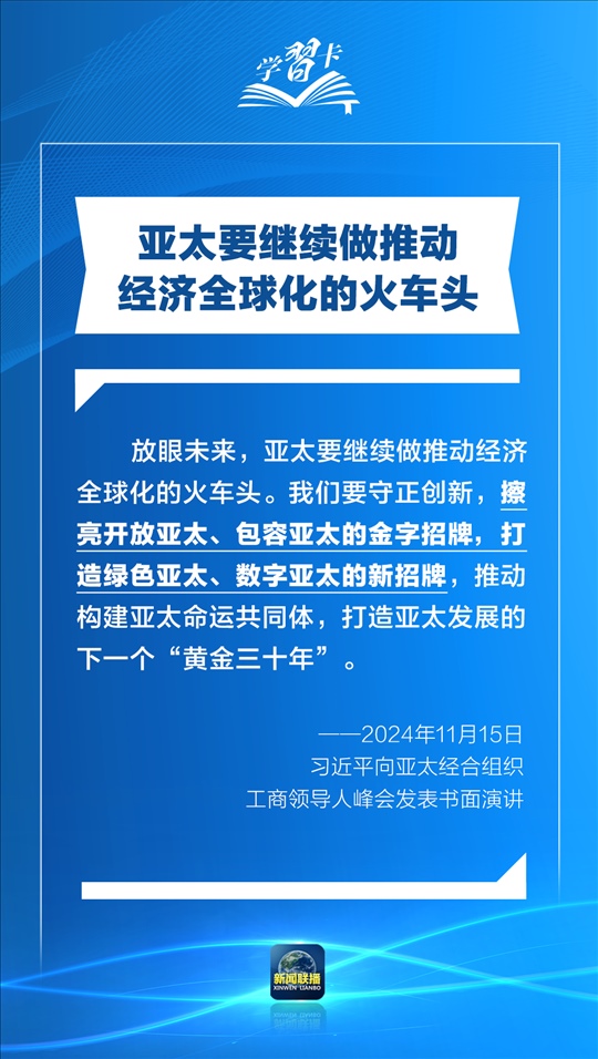習(xí)近平指出,過去30年,亞太地區(qū)經(jīng)濟保持了強勁增長,創(chuàng)造了舉世矚目的“亞太奇跡”。如何推動構(gòu)建亞太命運共同體,打造亞太發(fā)展的下一個“黃金三十年”?習(xí)主席強調(diào)了一個關(guān)鍵詞:經(jīng)濟全球化。一起學(xué)習(xí)↓