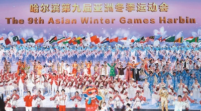 二月七日,第九屆亞洲冬季運(yùn)動(dòng)會(huì)開(kāi)幕式在黑龍江省哈爾濱市舉行。圖為演員在開(kāi)幕式上表演。