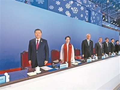 19時(shí)58分,在《和平——命運(yùn)共同體》的樂(lè)曲聲中,習(xí)近平和夫人彭麗媛,同國(guó)際奧委會(huì)主席巴赫、亞奧理事會(huì)第一副主席霍震霆等步入主席臺(tái),向觀眾揮手致意。全場(chǎng)響起長(zhǎng)時(shí)間的熱烈掌聲。