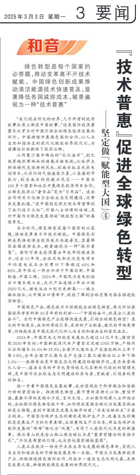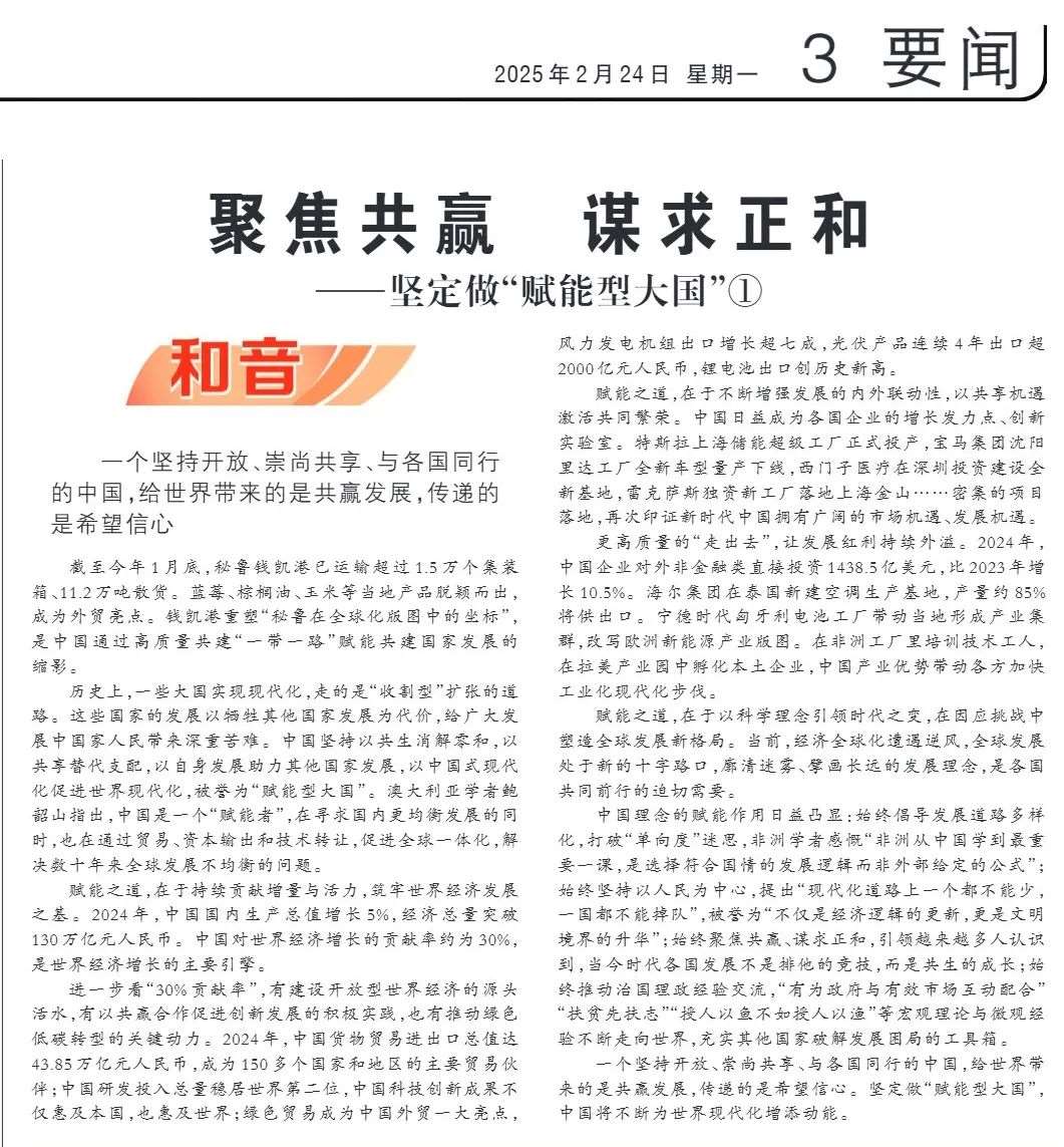 近期,《人民日報》“和音”欄目推出“堅定做‘賦能型大國’”系列評論,圍繞科技創(chuàng)新、開放共贏、綠色轉(zhuǎn)型、高質(zhì)量共建“一帶一路”、多邊治理等熱點議題,從不同角度闡釋中國何以成為一個“賦能型大國”的深層邏輯,展現(xiàn)中國始終秉持構建人類命運共同體理念,不斷以中國式現(xiàn)代化為世界現(xiàn)代化賦能的大國擔當。