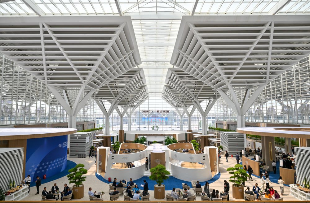 6月24日,兩名嘉賓在國家會展中心(天津)論壇會場設置的走廊空間交流。新華社記者 趙子碩 攝