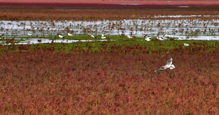 盤錦市濱海濕地,成百上千只黑嘴鷗正在覓食、飛翔?!昂谧禚t從20世紀(jì)90年代的1200只增長到現(xiàn)在的11000只,濕地活過來了!”盤錦市副市長徐同連說。