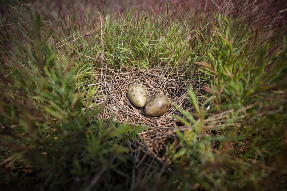 在遼河口國家級自然保護區(qū)南小河保護站附近的濕地,黑嘴鷗巢中有待孵化的蛋(2022年6月17日攝)。新華社記者 潘昱龍 攝