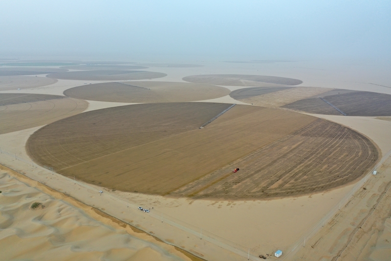在新疆和田地區(qū)策勒縣4萬(wàn)畝苜蓿種植基地,農(nóng)機(jī)手駕駛機(jī)械在播種苜蓿(9月9日攝,無(wú)人機(jī)照片)。