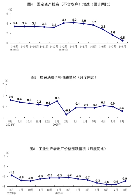 8月份,全國居民消費價格(CPI)同比下降0.4%,環(huán)比持平。分類別看,食品煙酒價格同比下降2.5%,衣著價格上漲1.8%,居住價格上漲0.1%,生活用品及服務(wù)價格上漲1.8%,交通通信價格下降2.4%,教育文化娛樂價格上漲1.0%,醫(yī)療保健價格上漲0.9%,其他用品及服務(wù)價格上漲8.6%。在食品煙酒價格中,豬肉價格下降16.1%,鮮菜價格下降15.2%,鮮果價格下降3.7%,糧食價格下降0.8%。扣除食品和能源價格后的核心CPI同比上漲0.9%,漲幅比上月擴大0.1個百分點。1—8月份,全國居民消費價格同比下降0.1%。