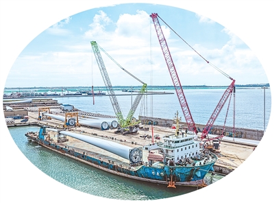 在山東省榮成市石島管理區(qū)的海上風(fēng)電產(chǎn)業(yè)基地,超大型風(fēng)電葉片正在吊裝和運輸,準(zhǔn)備運往海上作業(yè)區(qū)進(jìn)行安裝。李信君攝(人民視覺)