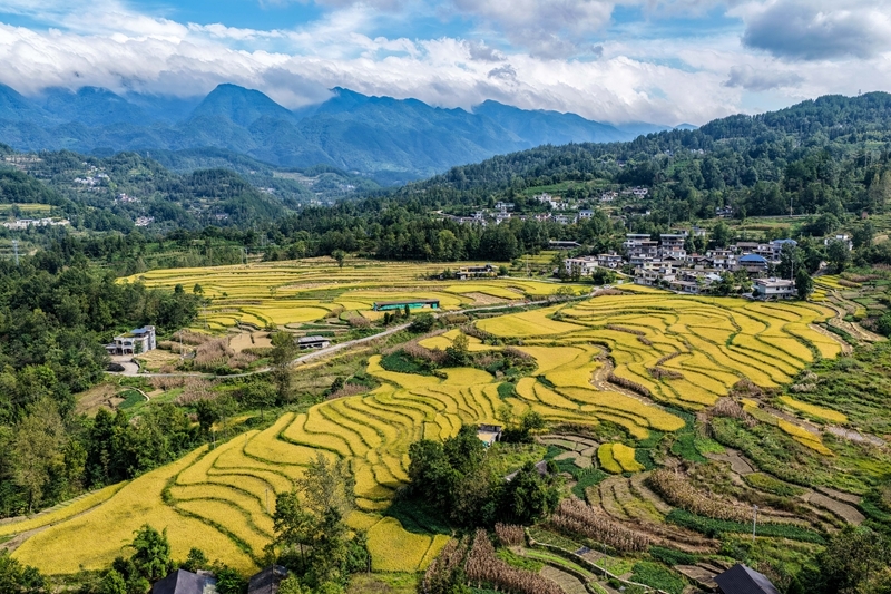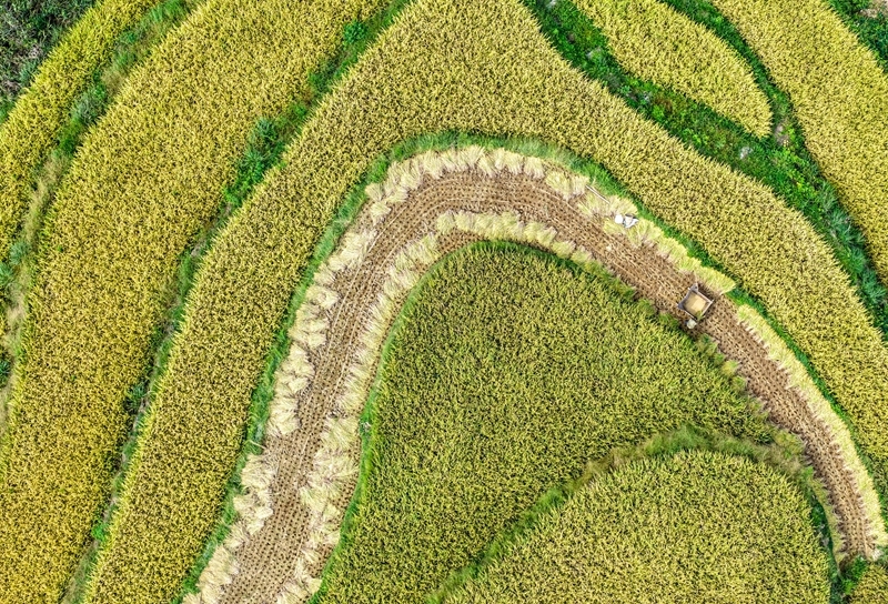 地處武陵山區(qū)腹地的重慶市黔江區(qū)五里鎮(zhèn)水稻種植面積5300畝,是武陵山地區(qū)糧食主要產(chǎn)區(qū)之一。秋收時(shí)節(jié),金黃色的水稻鋪滿山坡,稻農(nóng)們利用晴好天氣搶收稻谷,呈現(xiàn)出一派美麗的豐收畫卷。