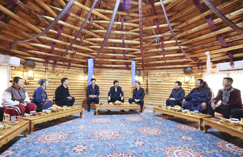 9月27日,受習(xí)近平總書(shū)記囑托,中共中央政治局常委、全國(guó)政協(xié)主席、中央代表團(tuán)團(tuán)長(zhǎng)王滬寧帶領(lǐng)中央代表團(tuán)部分成員到阿勒泰地區(qū)布爾津縣考察。這是王滬寧和中央代表團(tuán)部分成員在扎拉特鄉(xiāng)村旅游專(zhuān)業(yè)合作社同村民交流。新華社記者 姚大偉 攝