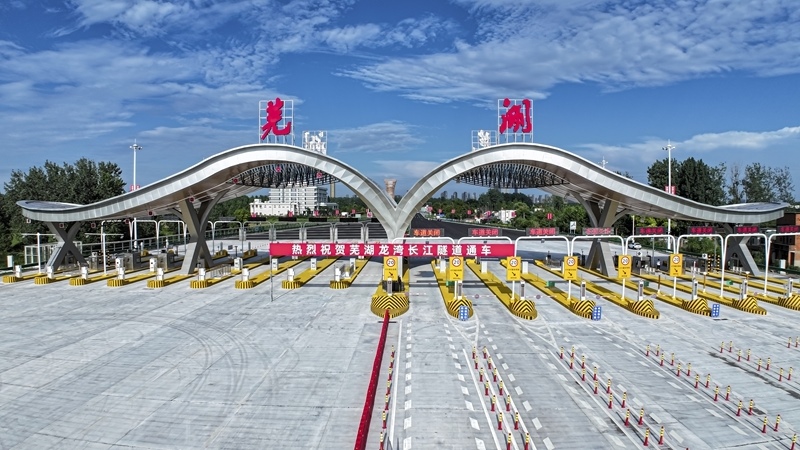 7月1日,車輛通過蕪湖龍灣長江隧道收費(fèi)站(無人機(jī)照片)。